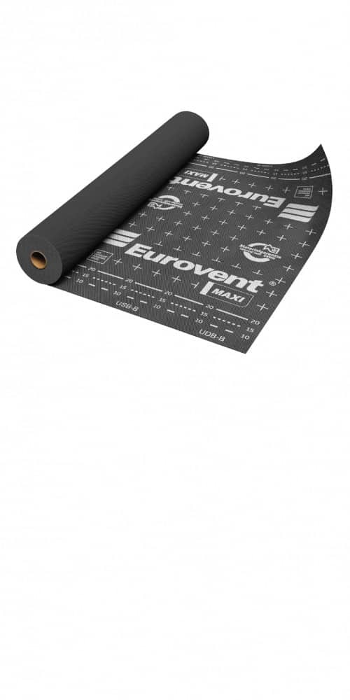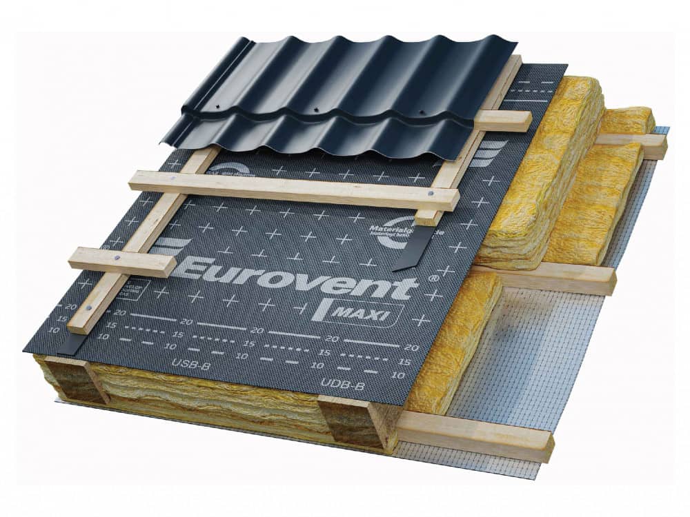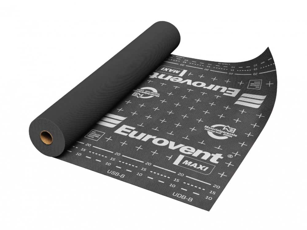 Покривната мембрана Eurovent® MAXI, трислойна, силно паропропусклива, използвана при скатни вентилирани покриви с финиш от бетонни, керамични или синтетични керемиди, покривни плочи, или шиндли. Използва се още и като противоветрена изолация при рамкова конструкция. За правилна вентилация на метален покрив тук.