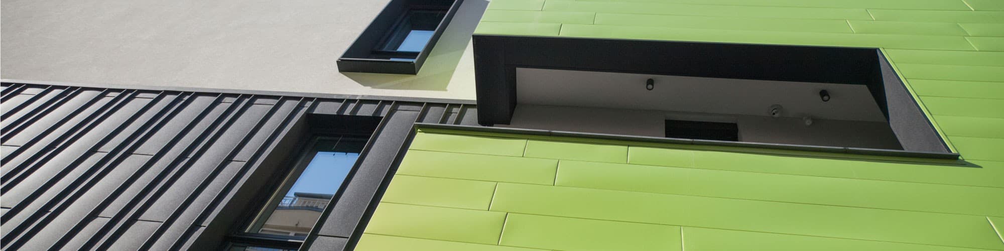 Вентилируема метална фасада FALZON®, капаци по бордовете, фасадни декоративни вентилирани обшивки LAMELLON®.
